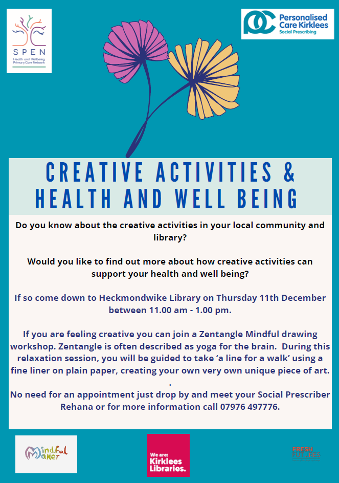 Free creative workshop helping you to relax, be mindful and destress! Drop by and see our Social Prescriber, Rehana, at Heckmondwike Library on the 11th of December.